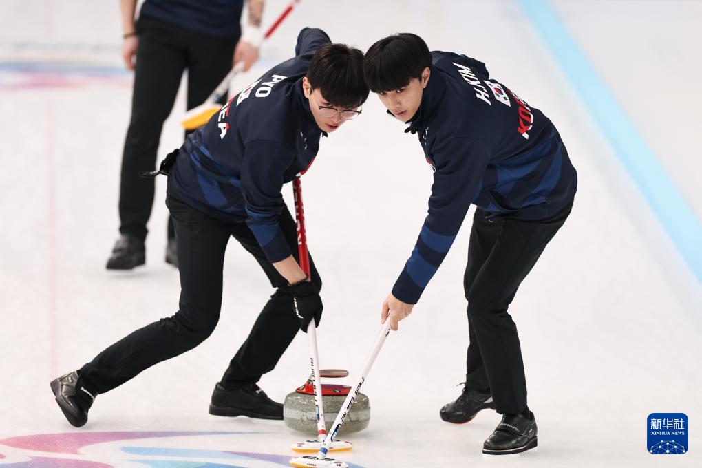 2月10日,韩国队选手表钟民(左)、金孝俊在比赛中擦冰。