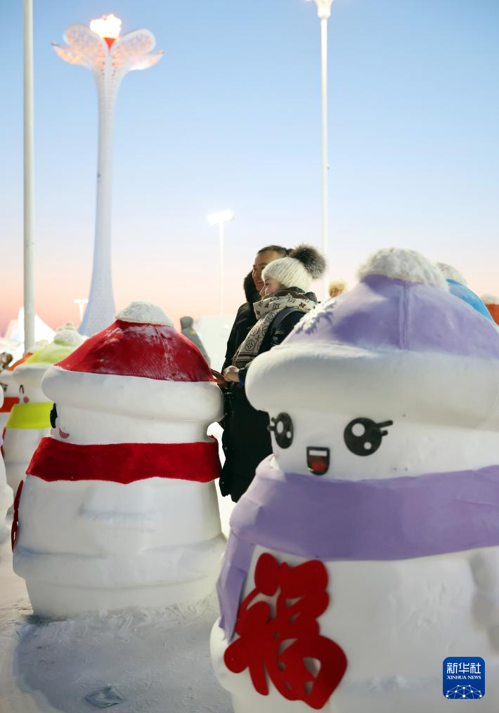 2月9日,游客在哈尔滨冰雪大世界亚冬会主火炬附近与雪人合影。