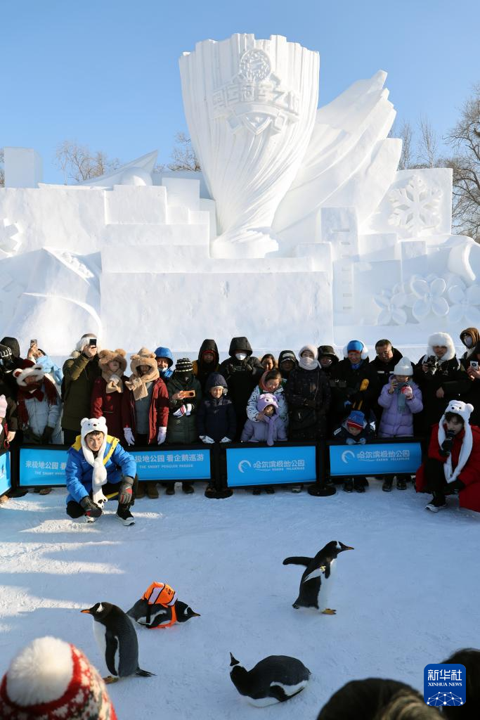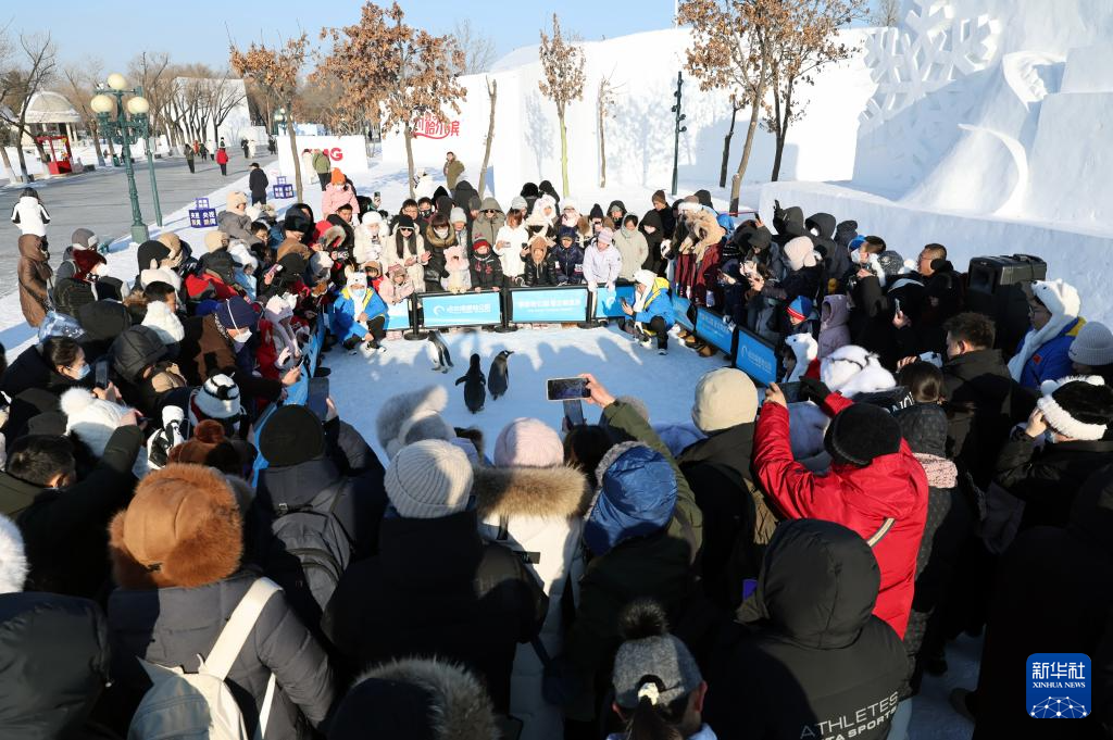 2月9日,游客在哈尔滨太阳岛雪博会上围观来自哈尔滨极地公园的小企鹅。
