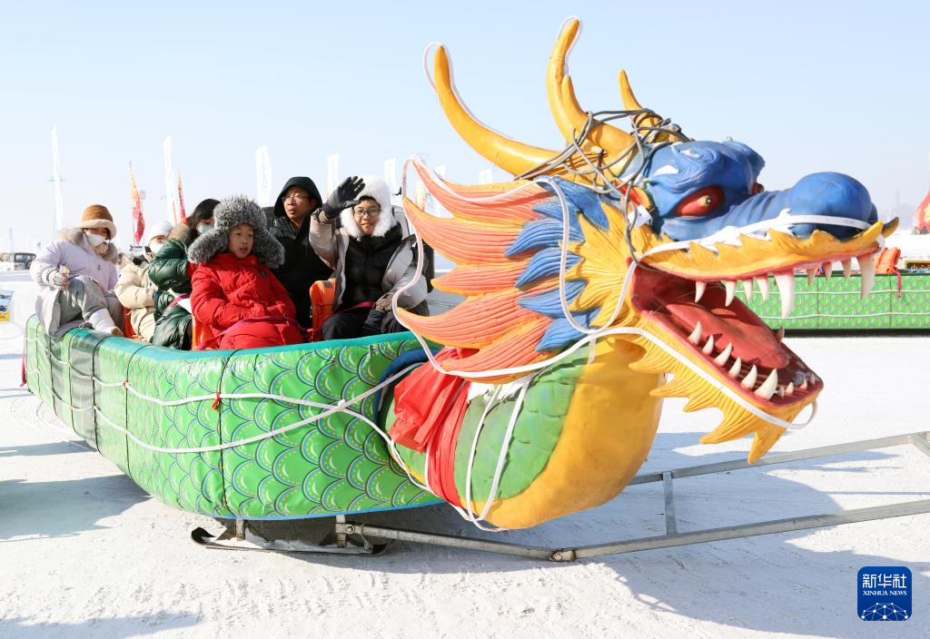 2月9日,游客在哈尔滨松花江冰雪嘉年华上乘坐雪地龙舟。