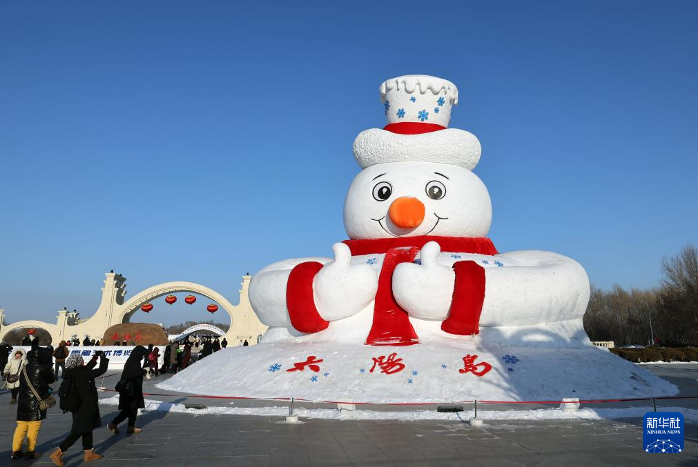2月9日,来自浙江衢州的姜先生一家在哈尔滨群力音乐公园参观网红大雪人时拍照留念。