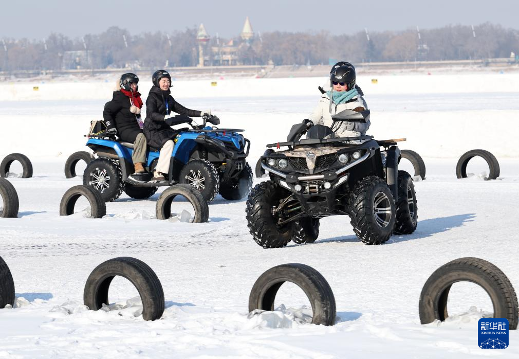 2月9日,人们在哈尔滨松花江冰雪嘉年华上体验驾驶雪地车。