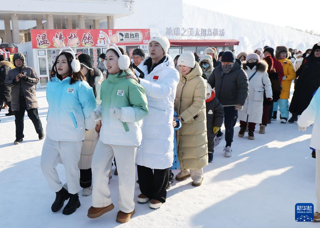 2月9日,冬奥冠军武大靖(前左三)在哈尔滨太阳岛雪博会上和游客一起跳雪地兔子舞。