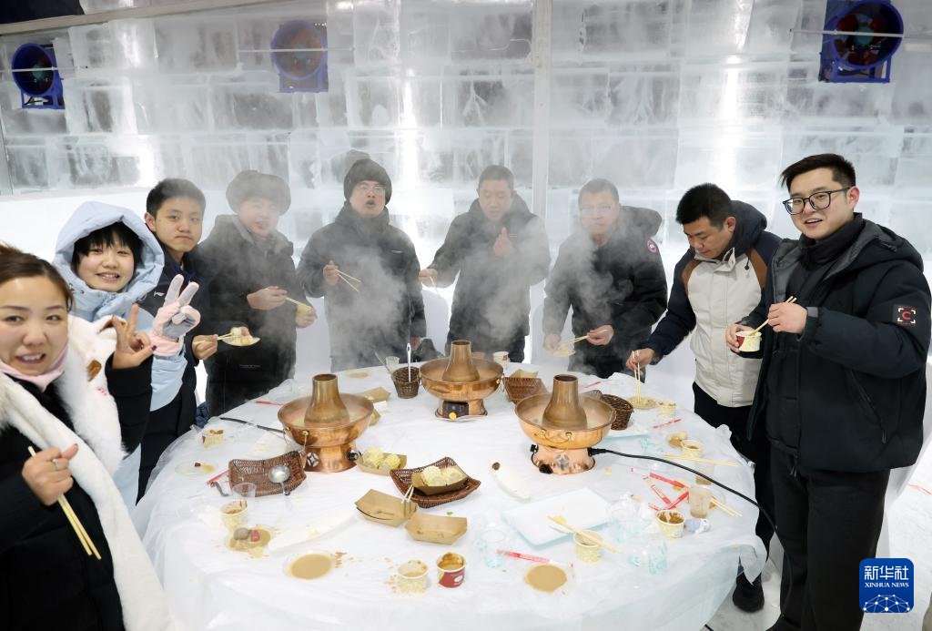 2月9日,来自北京的游客在哈尔滨冰雪大世界品尝冰上火锅。