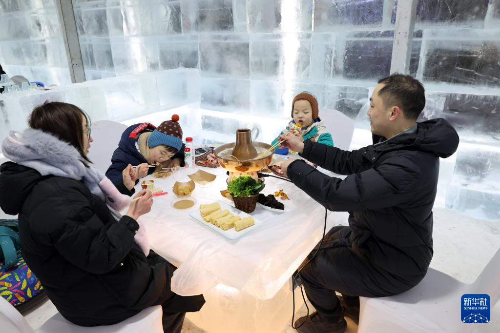 2月9日,来自江苏南通的张先生一家在哈尔滨冰雪大世界品尝冰上火锅。