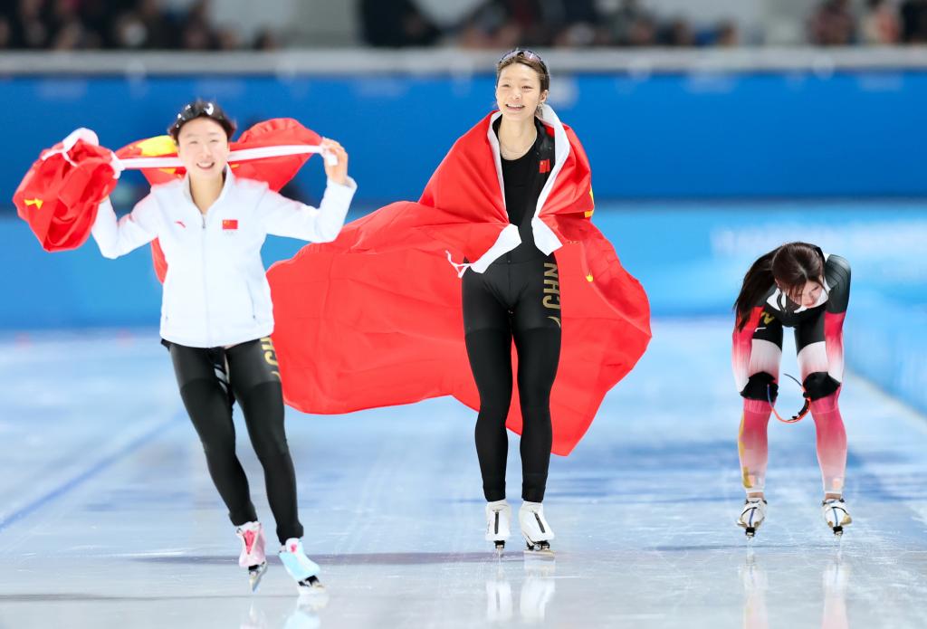 在女子3000米比赛中,中国队有杨滨瑜、韩梅、太智恩参赛。前四组结束,太智恩以4分12秒01暂列第一。第五组后,杨滨瑜以4分08秒54来到第一。最后一组出发前,中国队已确保一枚奖牌。当韩梅滑过终点线,成绩定格在4分09秒06。最终,杨滨瑜、韩梅、太智恩包揽女子3000米前三,三面五星红旗又一次在速滑馆同时升起。