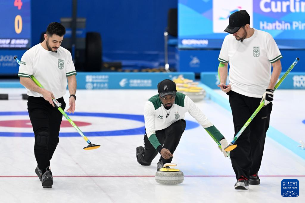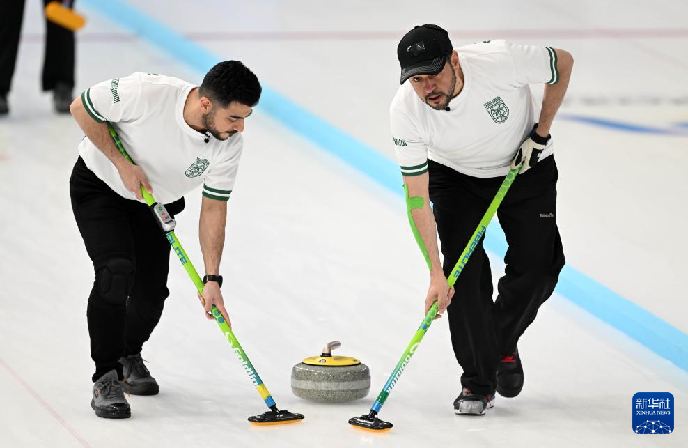 2月9日,沙特队选手侯赛因·哈加维(中)在比赛中掷壶。