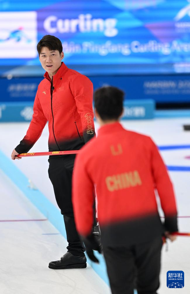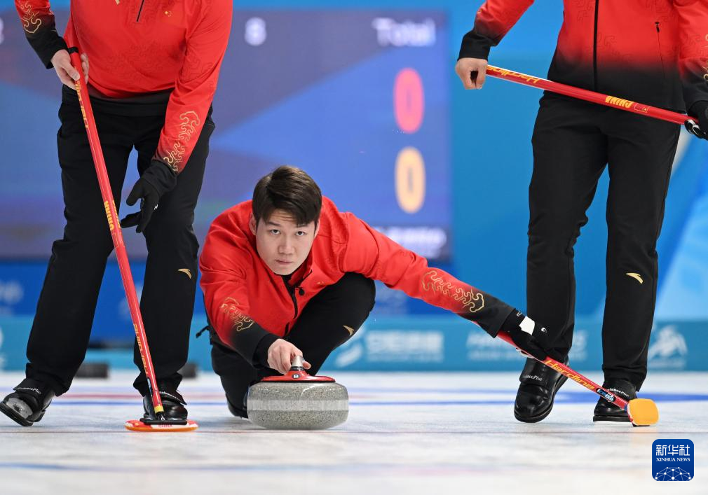 2月9日,中国队选手冶建军在比赛中掷壶。