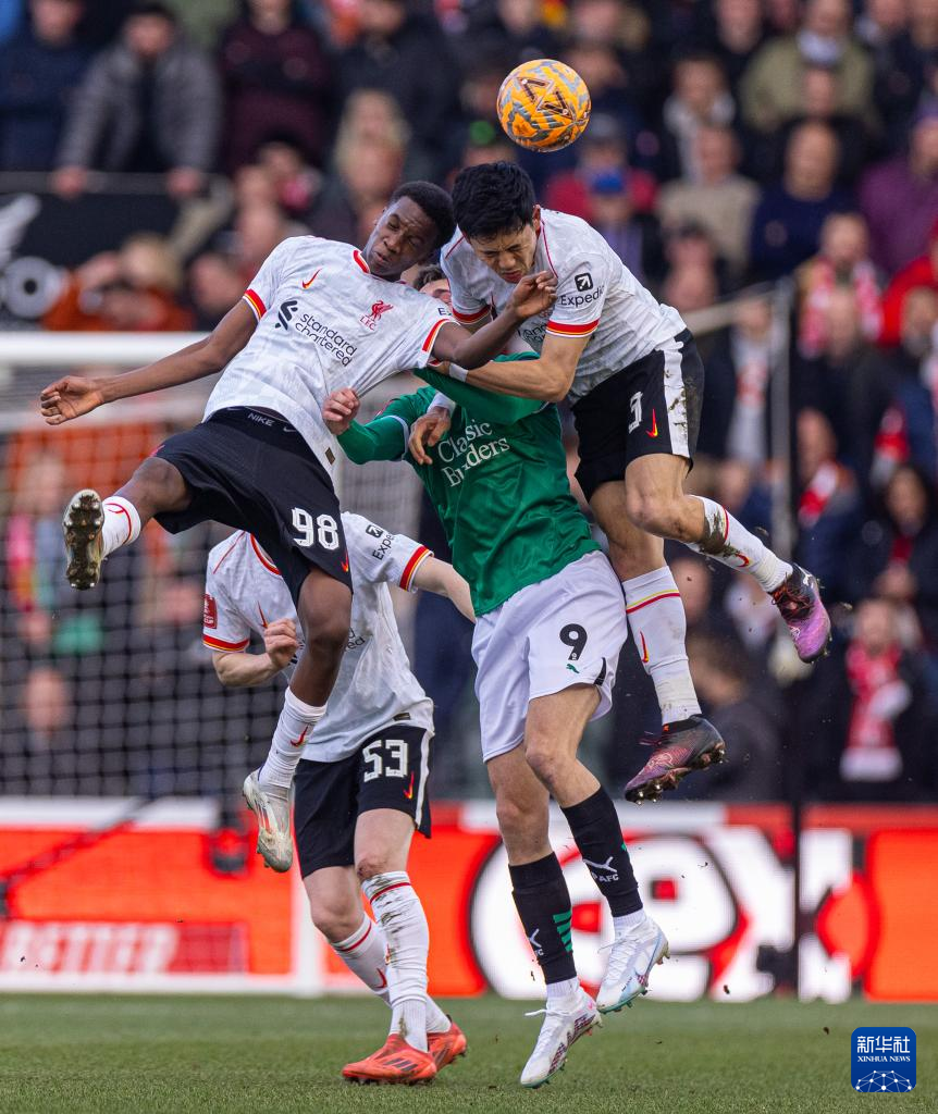 2月9日,利物浦队球员尼奥尼(左)、远藤航(右)与普利茅斯队球员哈迪争顶。