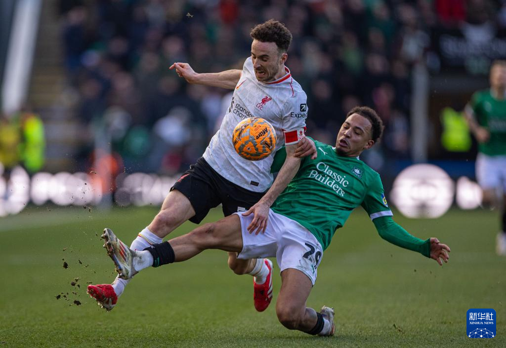 2月9日,利物浦队球员若塔(左二)与普利茅斯队球员拼抢。