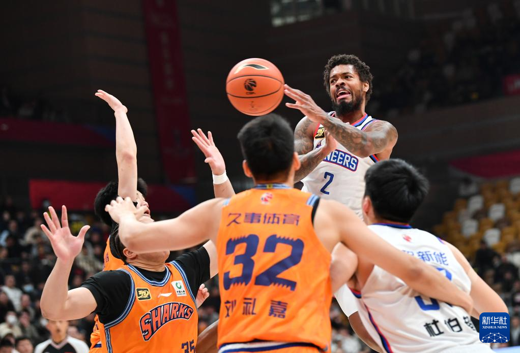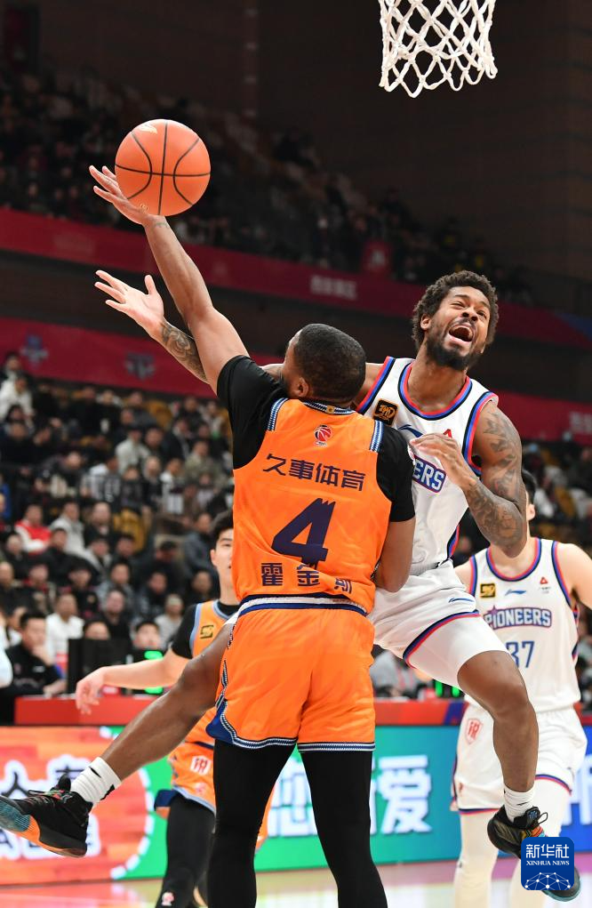 2月10日,上海久事队球员洛夫顿(中)在比赛中进攻。