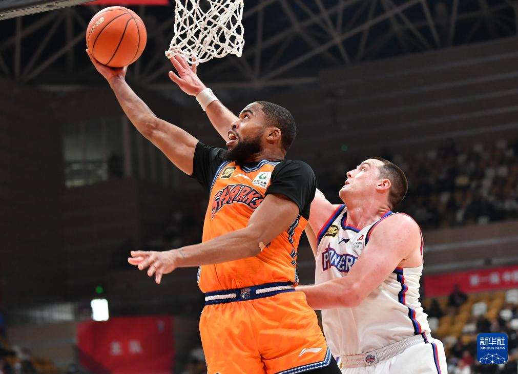 2月10日,上海久事队球员霍金斯(左)在比赛中上篮。