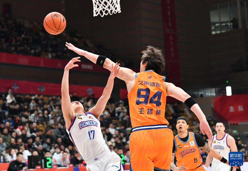 2月10日,上海久事队球员王哲林(中)封盖天津先行者队球员孙承信(左一)投篮。