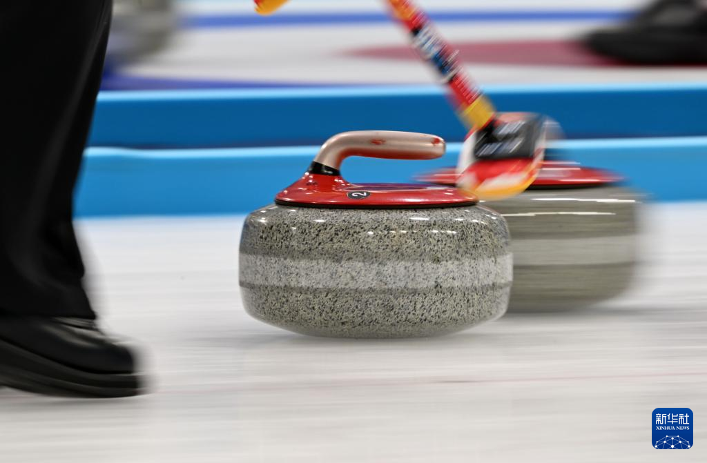 2月9日,中国队选手韩雨在比赛中掷壶。