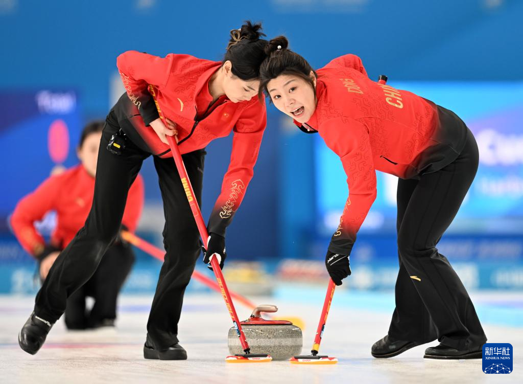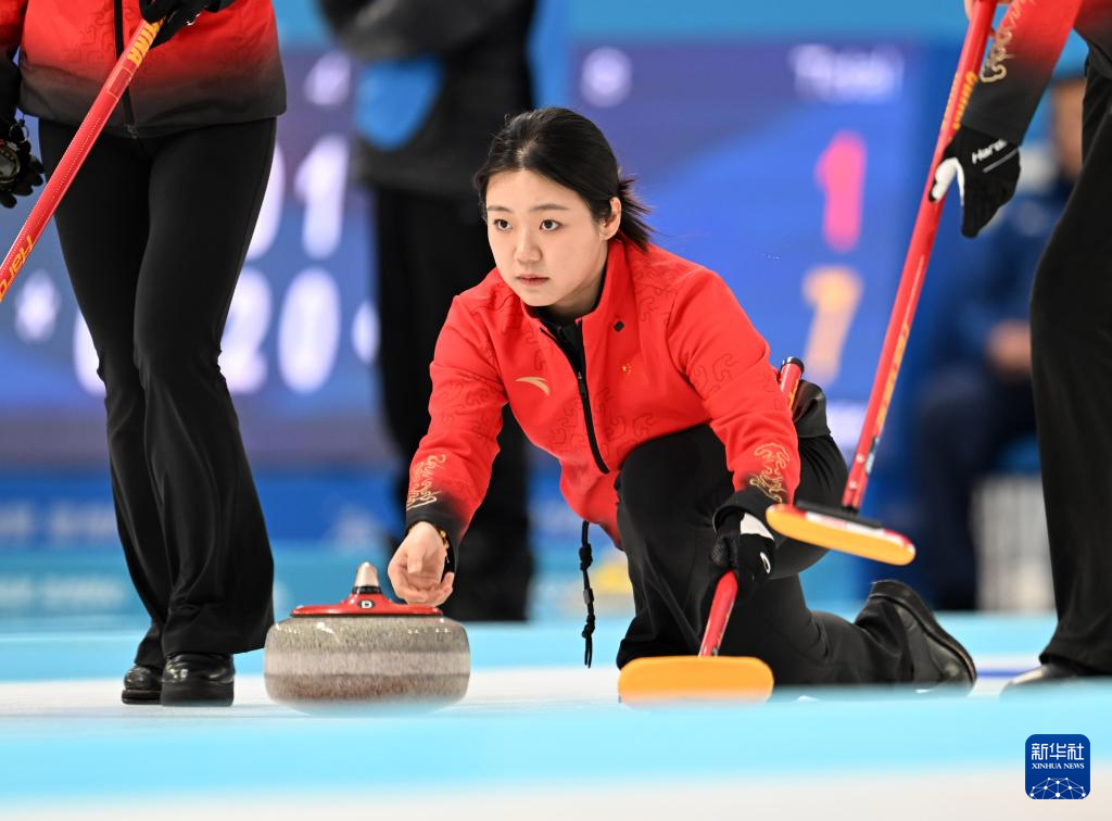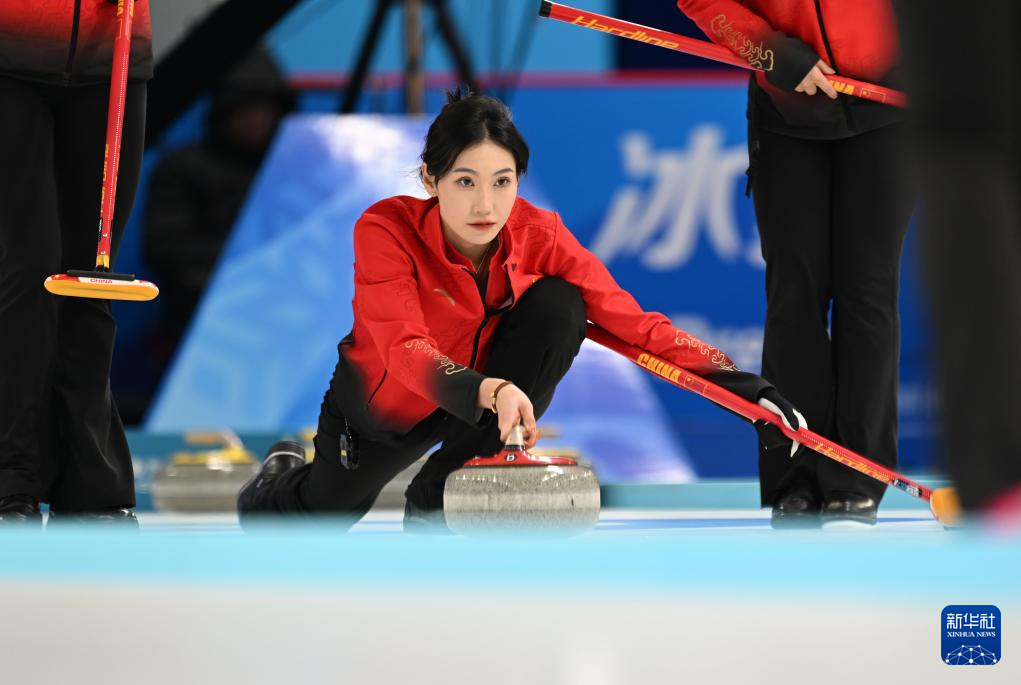 2月9日,中国队选手韩雨(中)在比赛中掷壶。