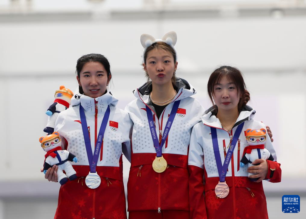 2月10日,中国选手冠军杨滨瑜(中)、亚军韩梅(左)与季军太智恩在颁奖仪式上。
