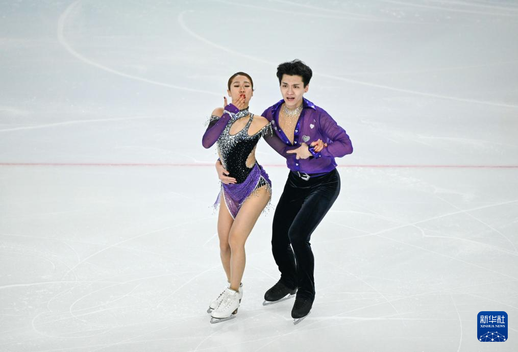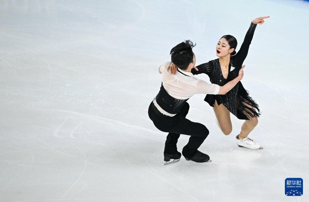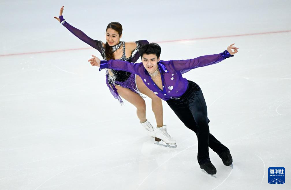 2月11日,中国组合肖紫兮(上)/何凌昊在比赛中。最终,他们以62.64分的成绩暂列第四。