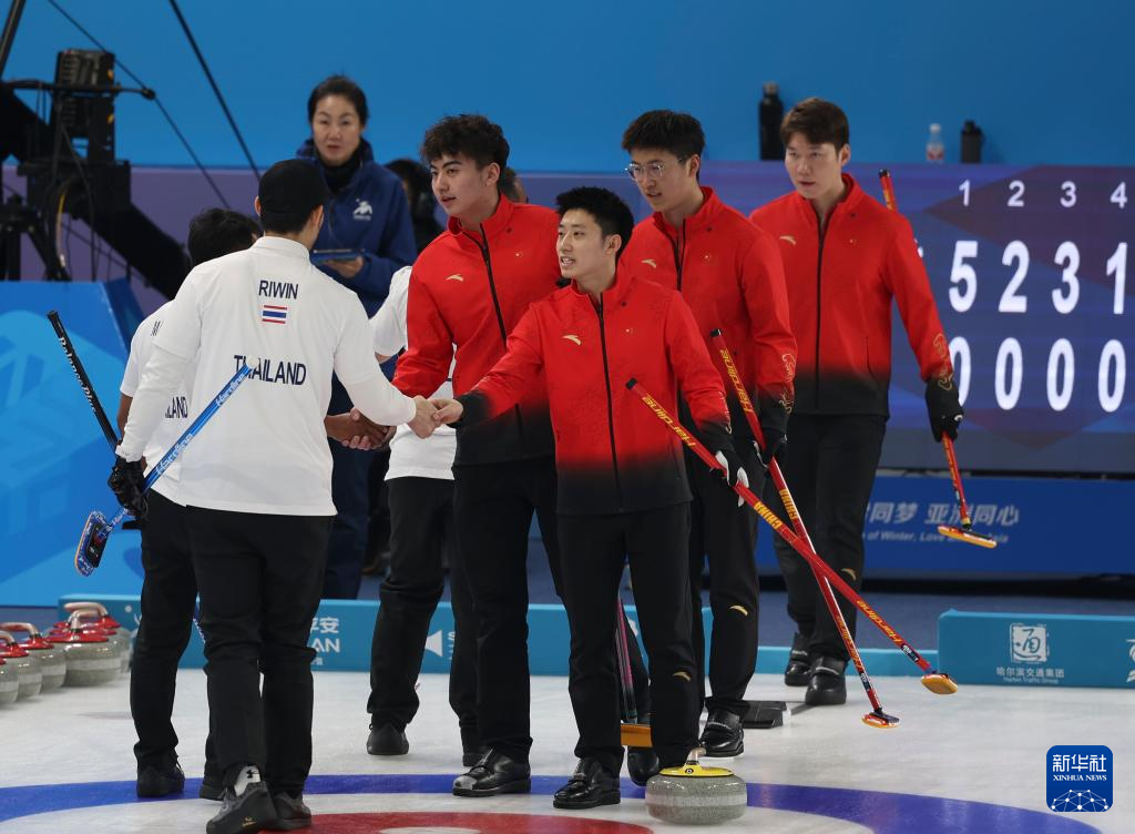 当日,在哈尔滨平房区冰壶馆举行的第九届亚冬会冰壶男子循环赛B组第九轮比赛中,中国队16比1战胜泰国队。