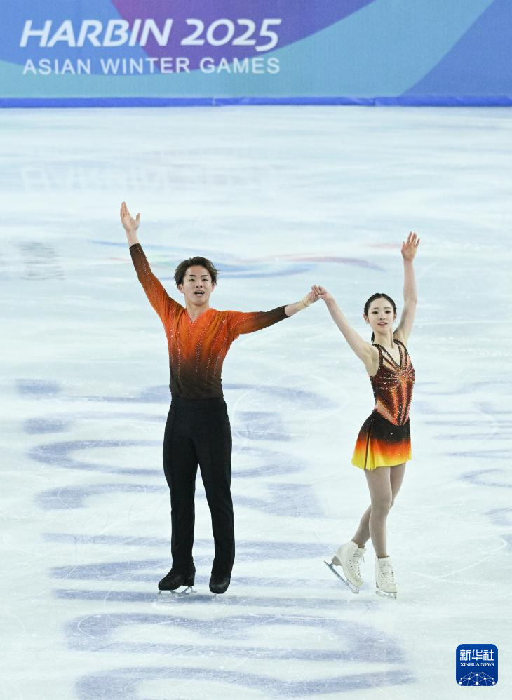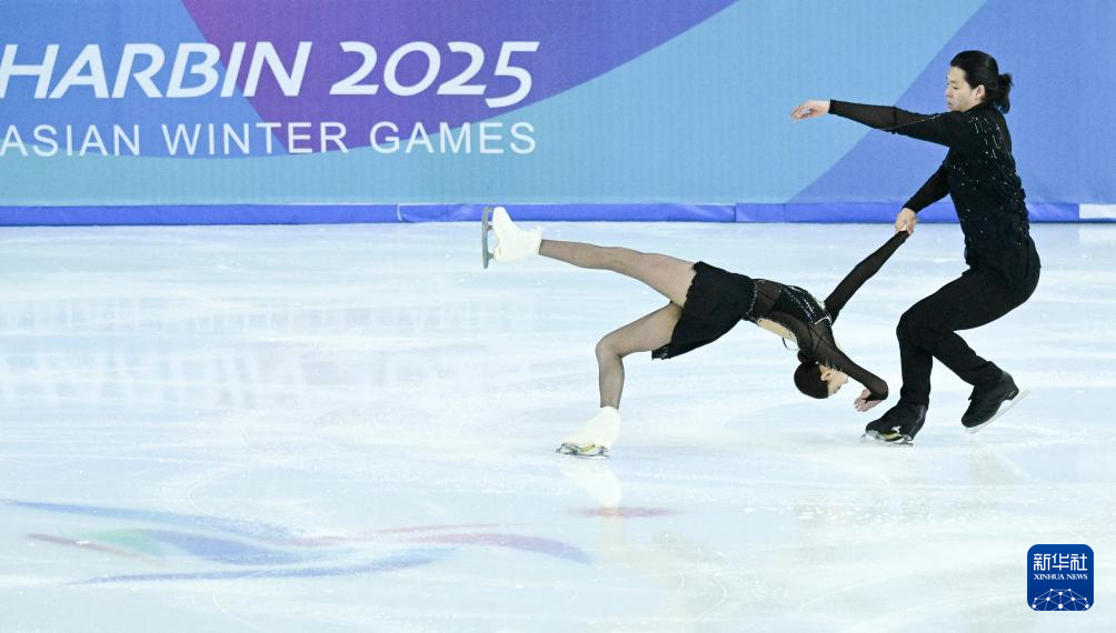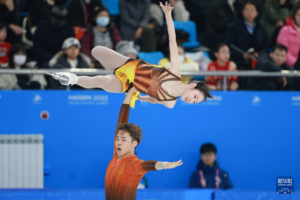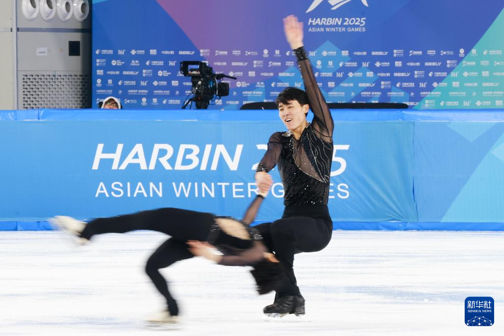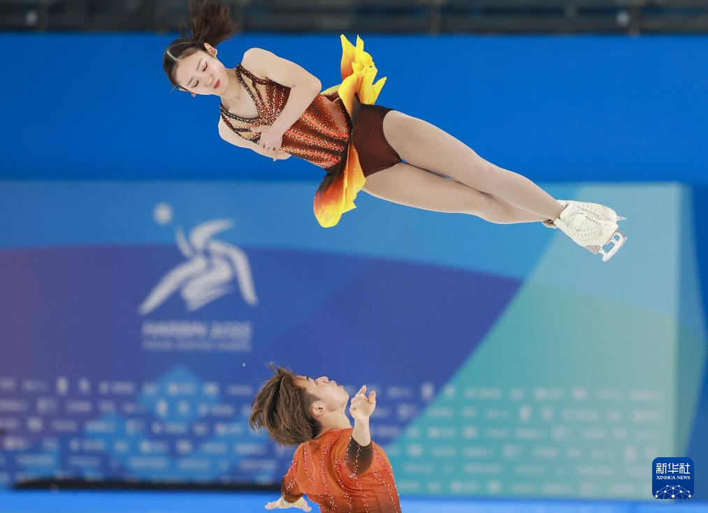 当日,第九届亚冬会花样滑冰项目双人滑短节目比赛在黑龙江省冰上训练中心综合馆举行。