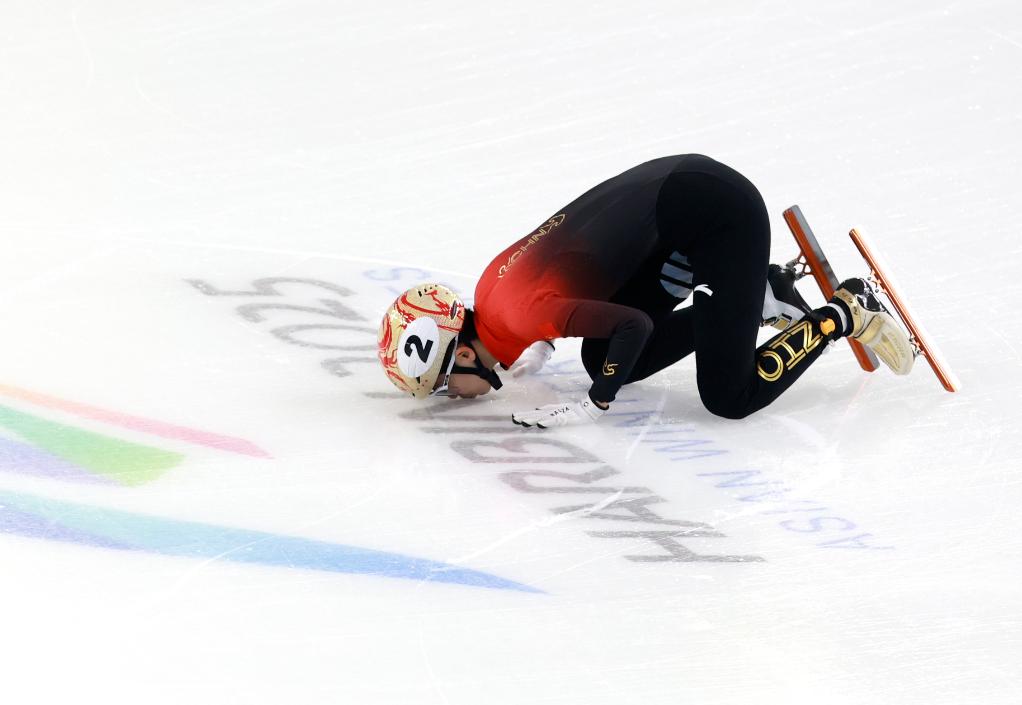 2月9日,范可新赛后亲吻冰面。新华社记者 许雅楠 摄