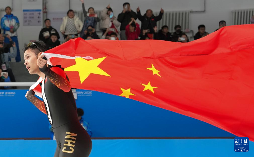 当日,第九届亚冬会速度滑冰男子1000米决赛在哈尔滨举行。中国选手宁忠岩夺得冠军。