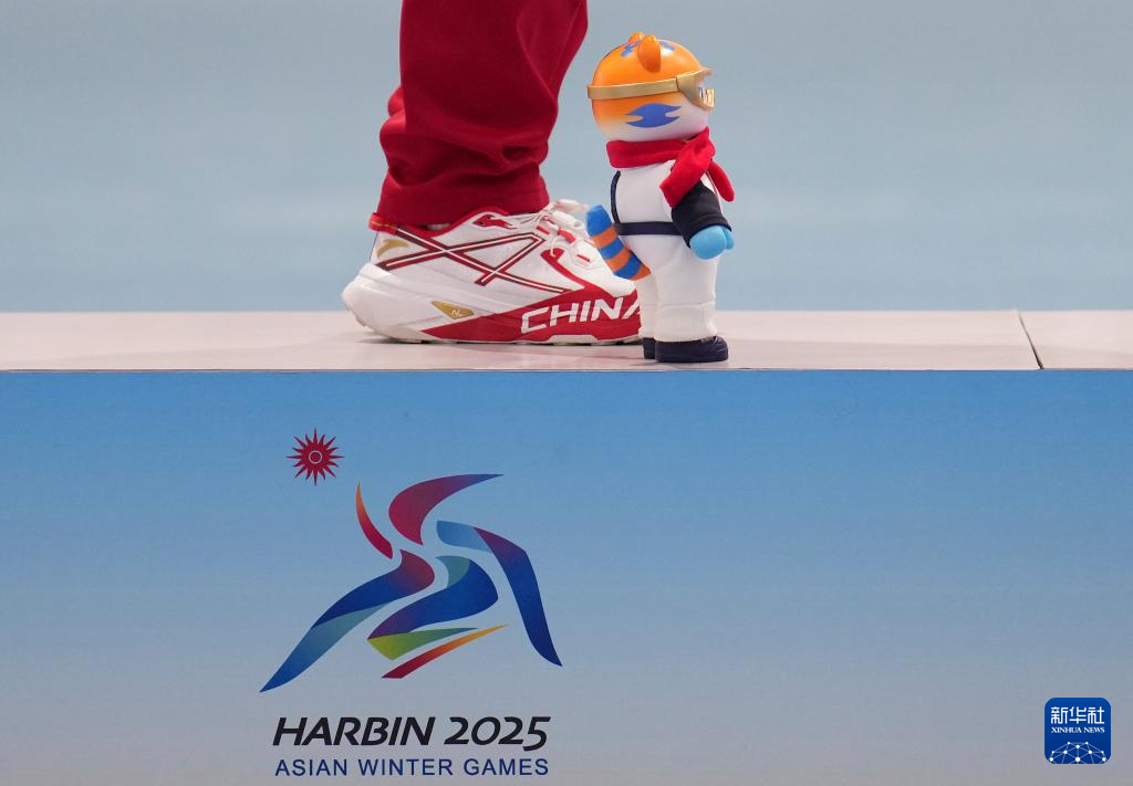 2月11日,宁忠岩在颁奖仪式上,脚边是本届亚冬会吉祥物“滨滨”。