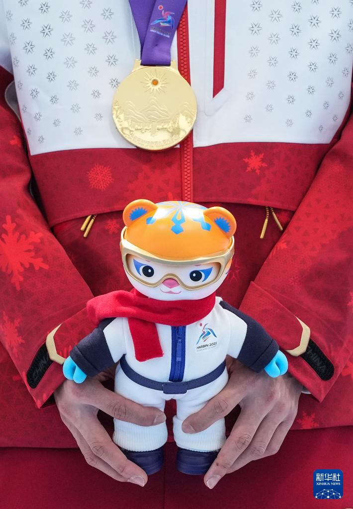 2月11日,宁忠岩在颁奖仪式上手持本届亚冬会吉祥物“滨滨”。