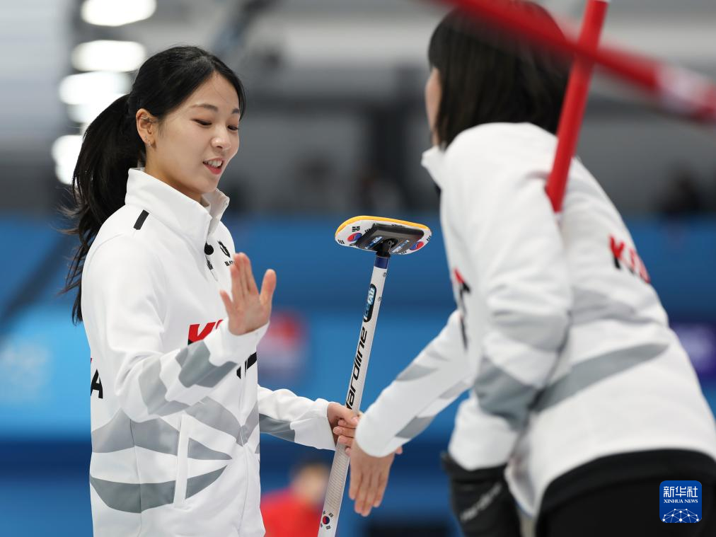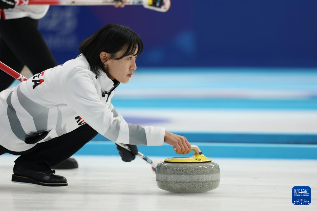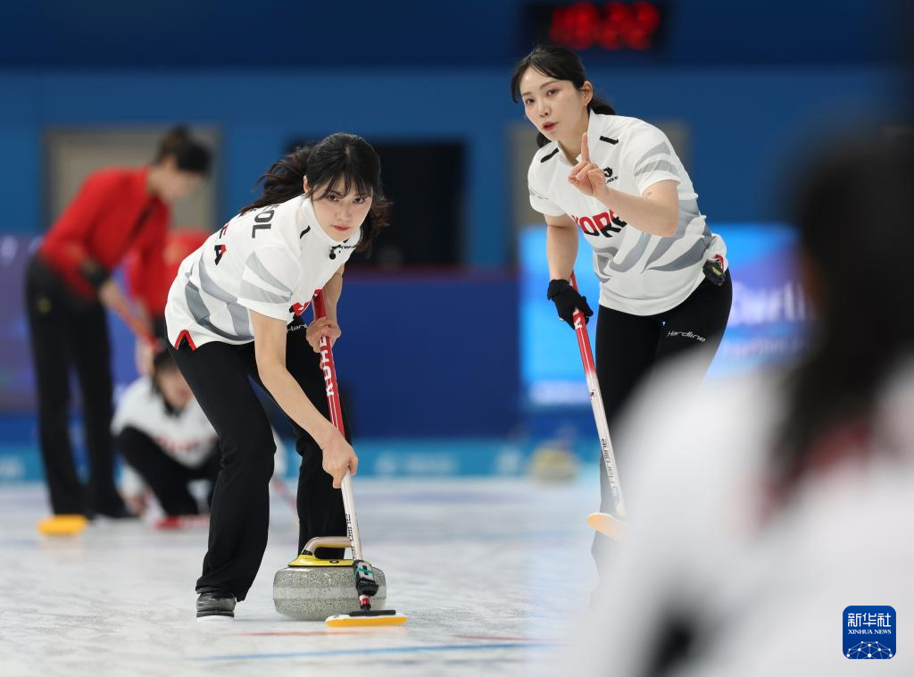 2月11日,韩国队选手薛誉恩(左)在比赛中掷壶。
