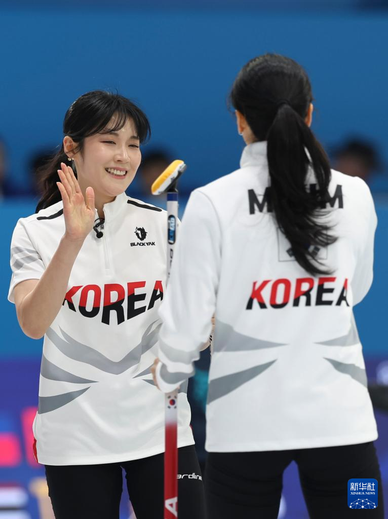 2月11日,韩国队选手薛誉恩(左)和金敏姬在比赛中击掌。