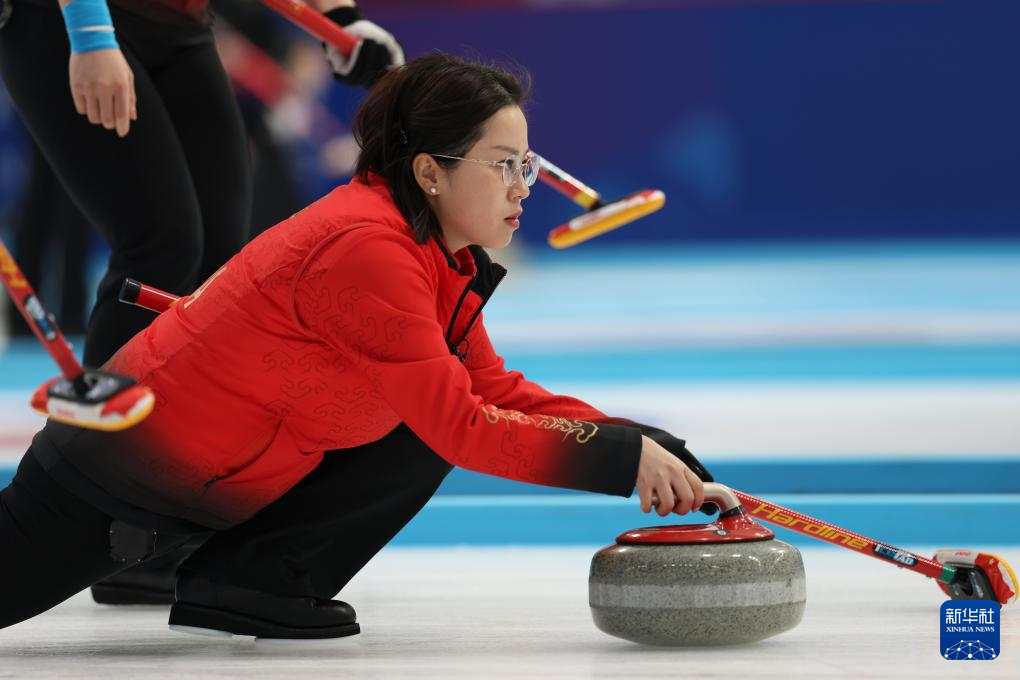 2月11日,中国队选手王芮在比赛中掷壶。