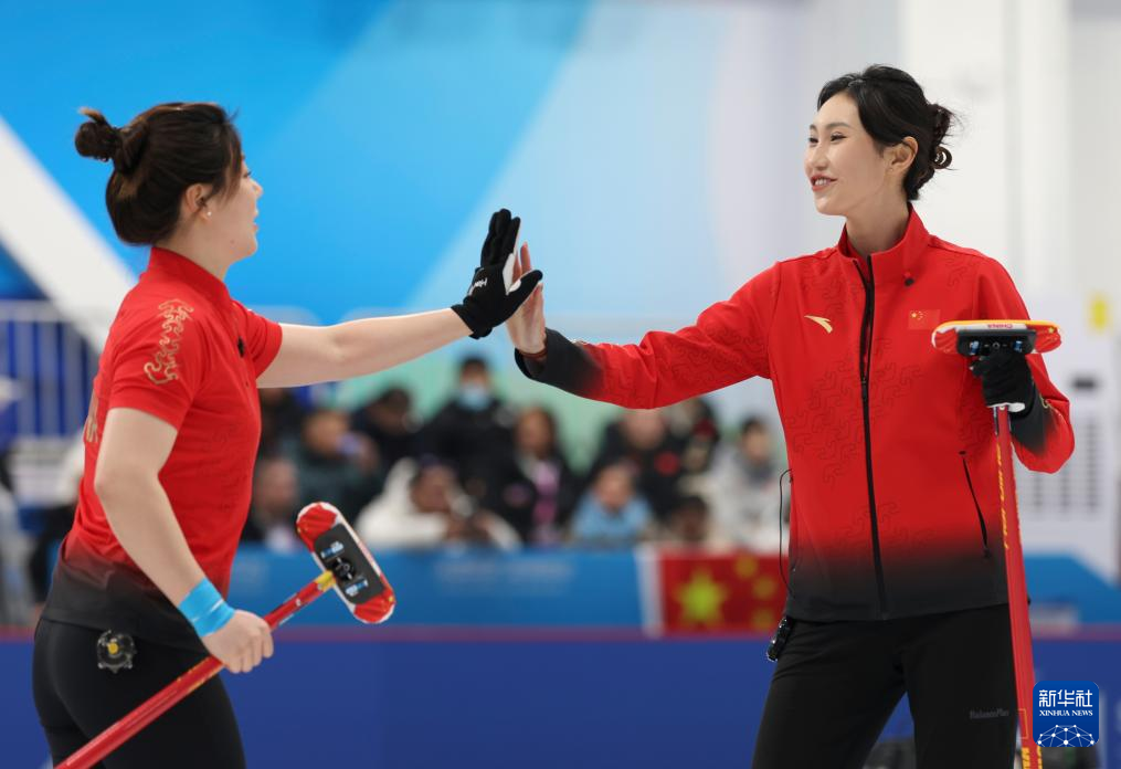 2月11日,中国队选手姜嘉怡(右)和董子齐在比赛中击掌。