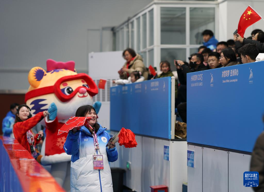 2月11日,志愿者和吉祥物“妮妮”在比赛前与观众互动。