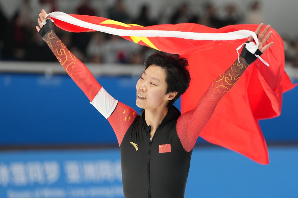 2022年2月17日,中国选手殷琦在北京冬奥会速度滑冰女子1000米决赛中。新华社记者 王菲 摄