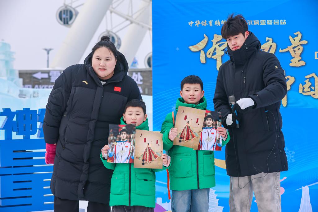 2月11日,在哈尔滨冰雪大世界园区举行的“中华体育精神颂·哈尔滨亚冬会站”活动中,举重奥运冠军李雯雯(左一)、游泳奥运冠军潘展乐(右一)和两名参加活动的小朋友合影。新华社发