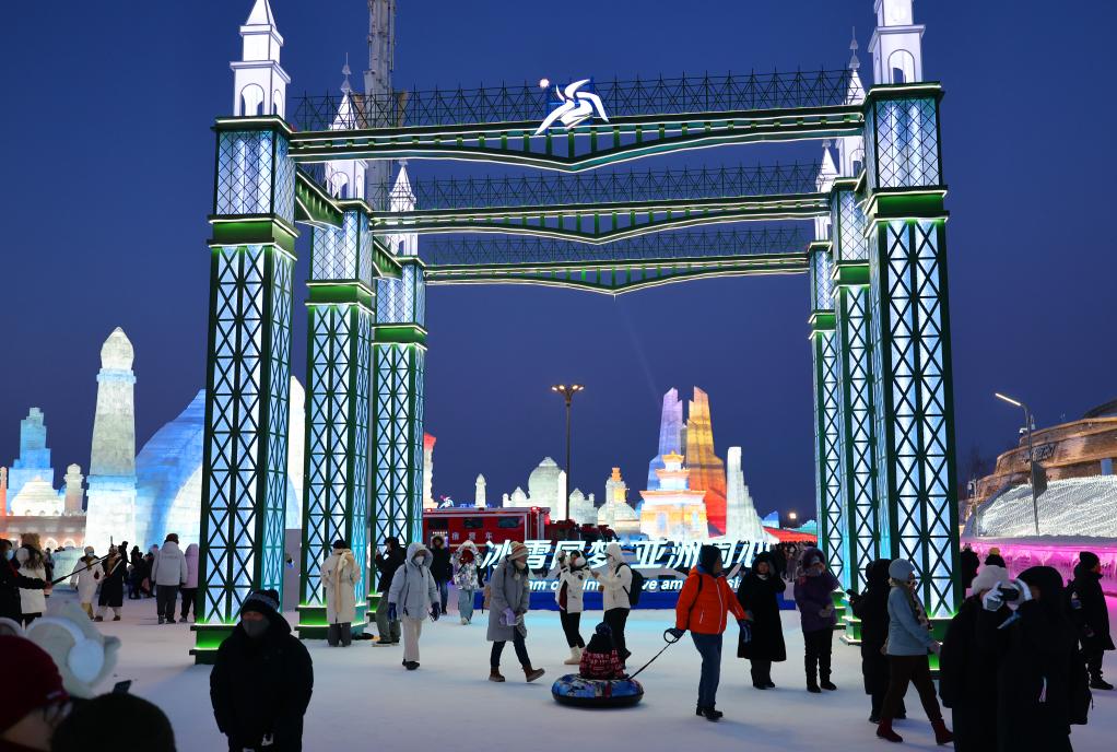 2月9日,游客在哈尔滨冰雪大世界游览。新华社记者 侯俊 摄