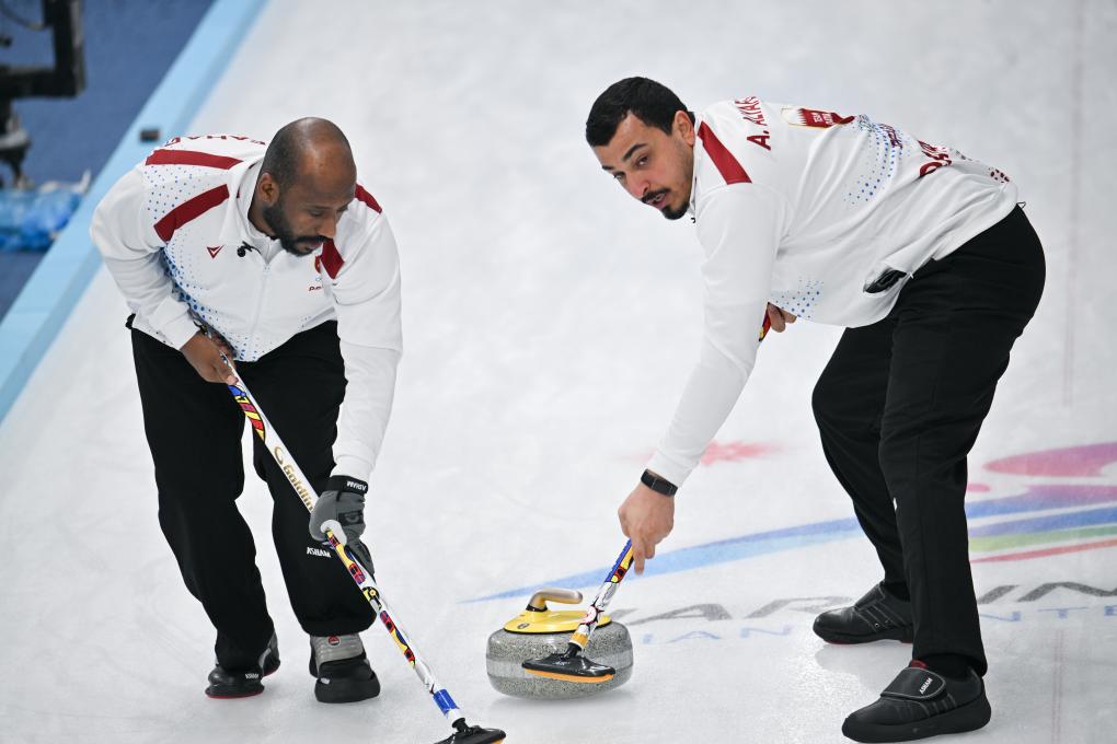 2月11日,卡塔尔队选手阿卜杜勒拉赫曼·卡西姆·阿尔亚菲(右)和艾哈迈德·萨阿德·阿尔-法赫德在比赛中擦冰。新华社记者 辛悦卫 摄