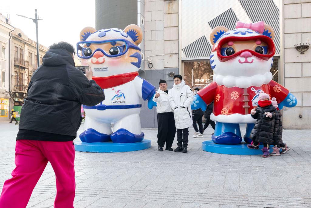 1月8日,在哈尔滨中央大街,游客在亚冬会吉祥物景观处留影。新华社记者 谢剑飞 摄