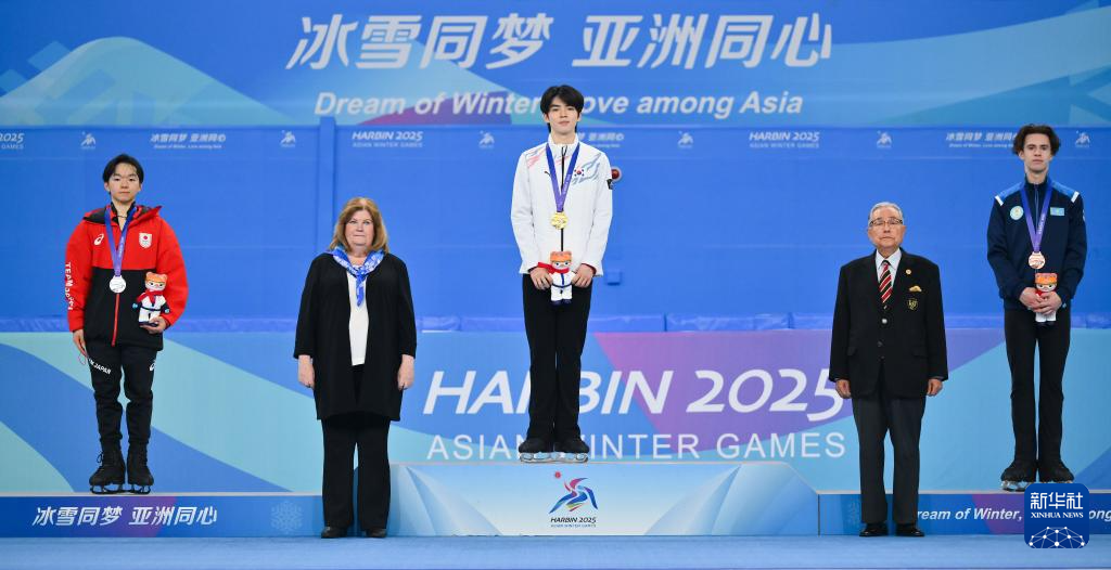 2月13日,冠军韩国选手车俊焕(中)、亚军日本选手键山优真(左一)和季军哈萨克斯坦选手米哈伊尔·萨多洛夫(右一)在颁奖仪式后合影留念。