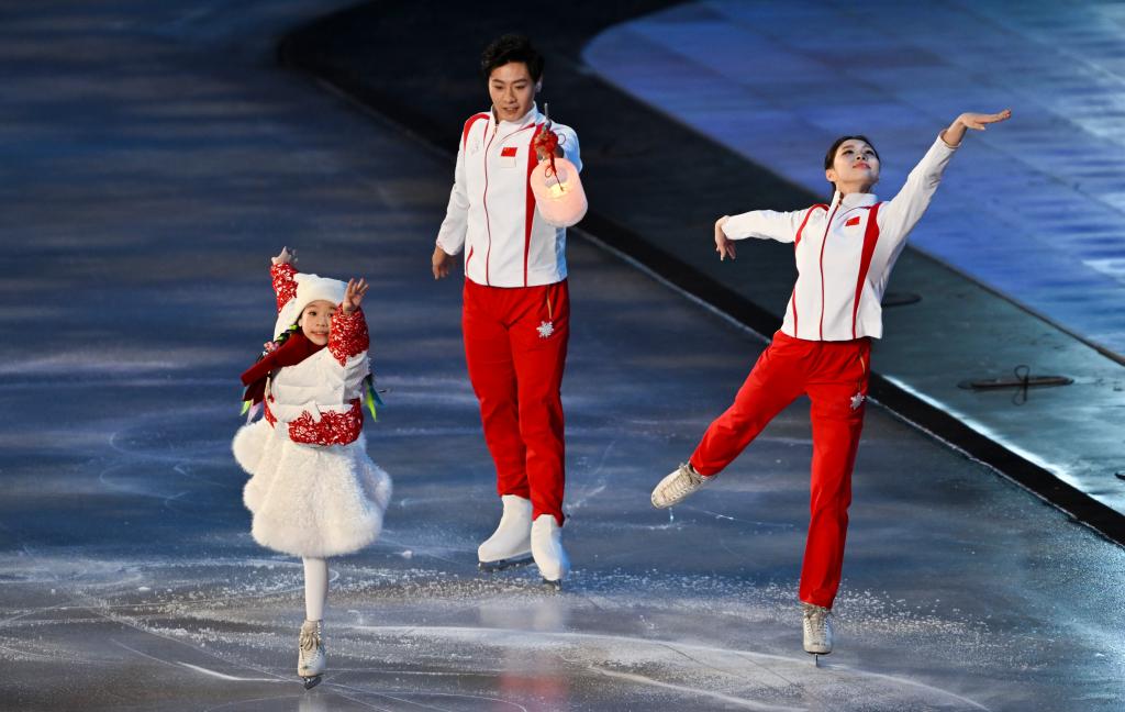 7日晚,在开幕式“启梦”篇章向“追梦”篇章过渡时,身姿妙曼的芭蕾舞演员翩翩起舞,一位小女孩手持冰灯,滑上五彩斑斓的冰面。随后,两位花样滑冰运动员来到她的身前,接过她手中的冰灯,带领她一同滑行。