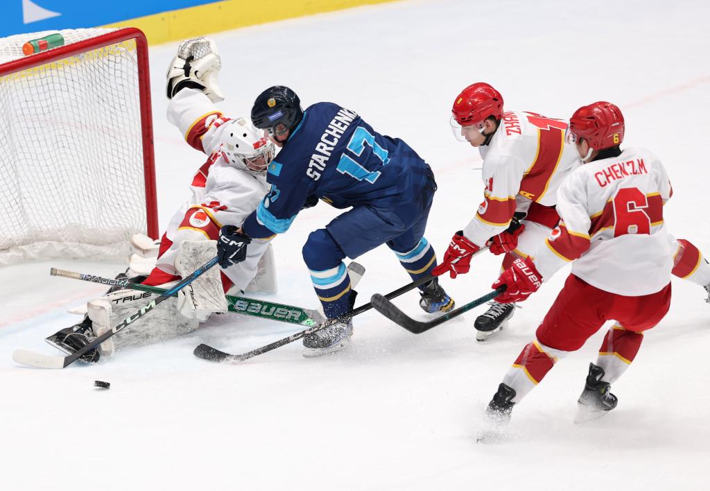 男冰半决赛,面对小组赛曾1:6输给的对手哈萨克斯坦队,中国队打得十分顽强,特别是门将陈世枫扑出了对手多个必进之球。直到第二节,第37分钟,哈萨克斯坦队才由队长斯塔尔琴科在混战中打破僵局。第40分钟,格伦茨为哈萨克斯坦队扩大领先优势。