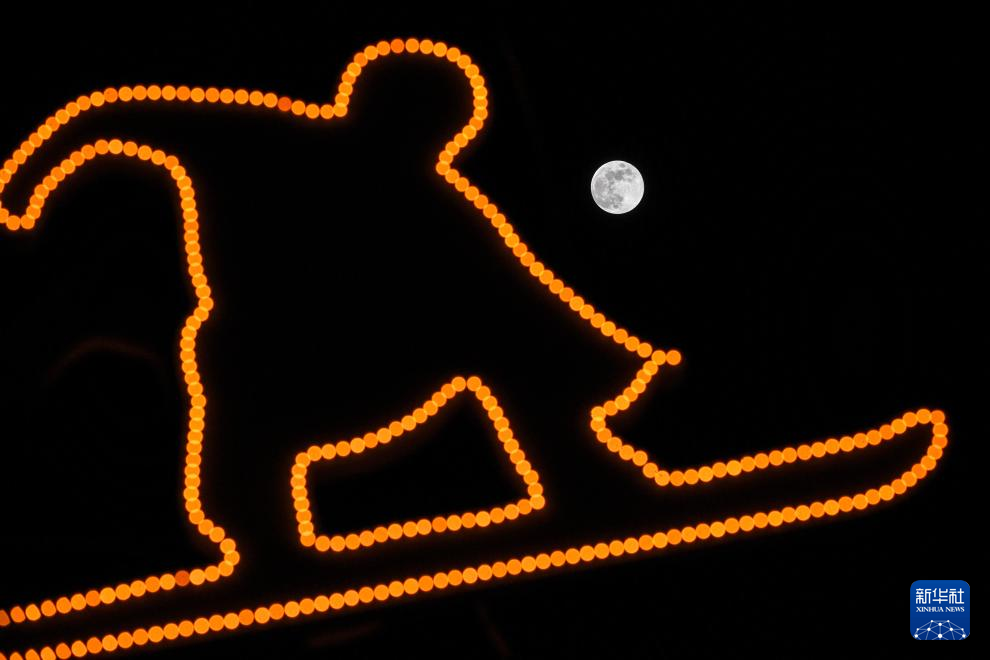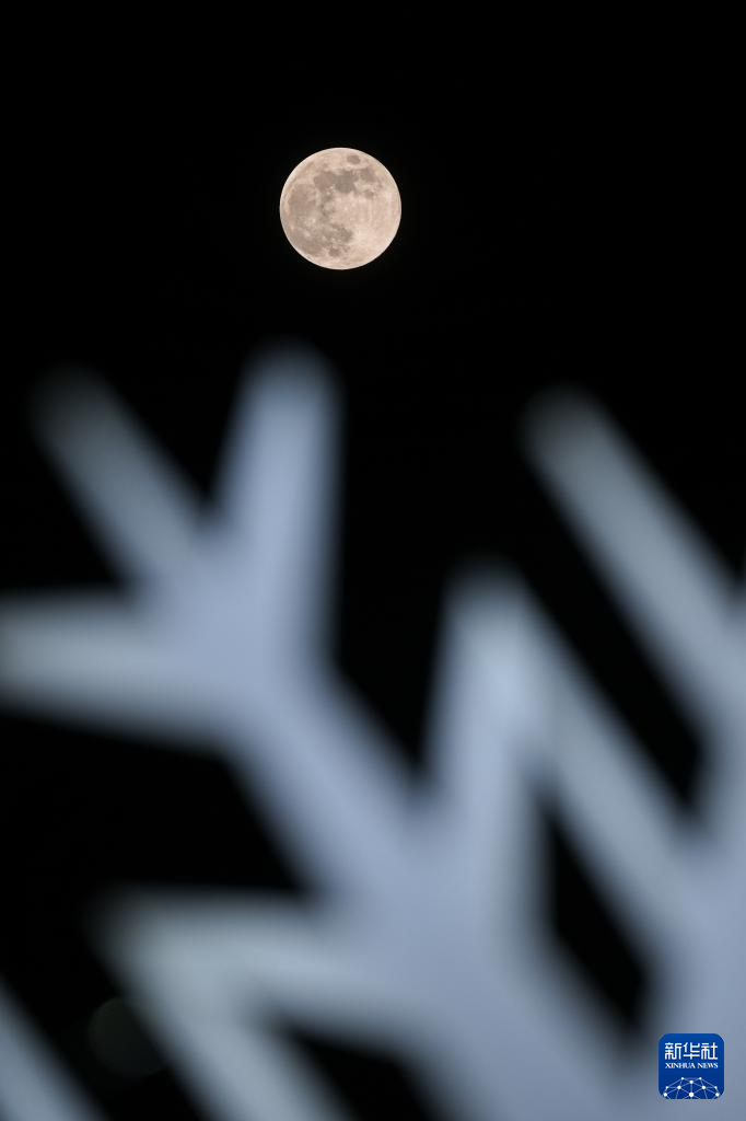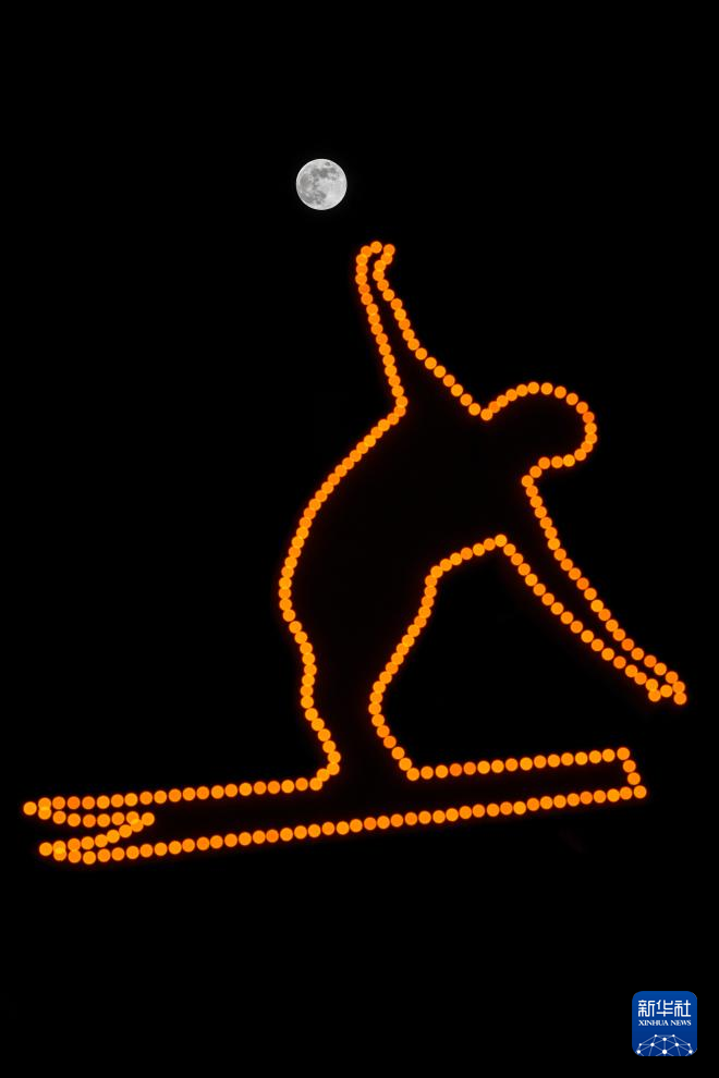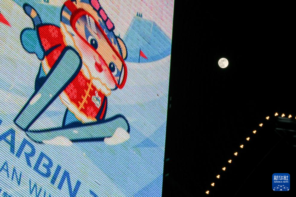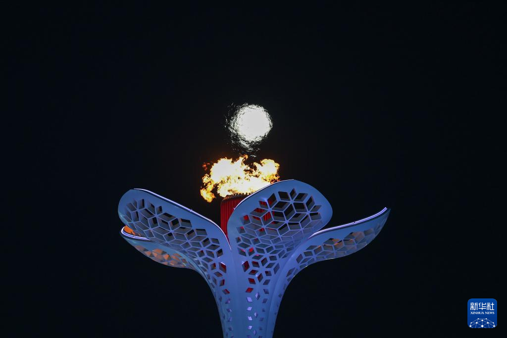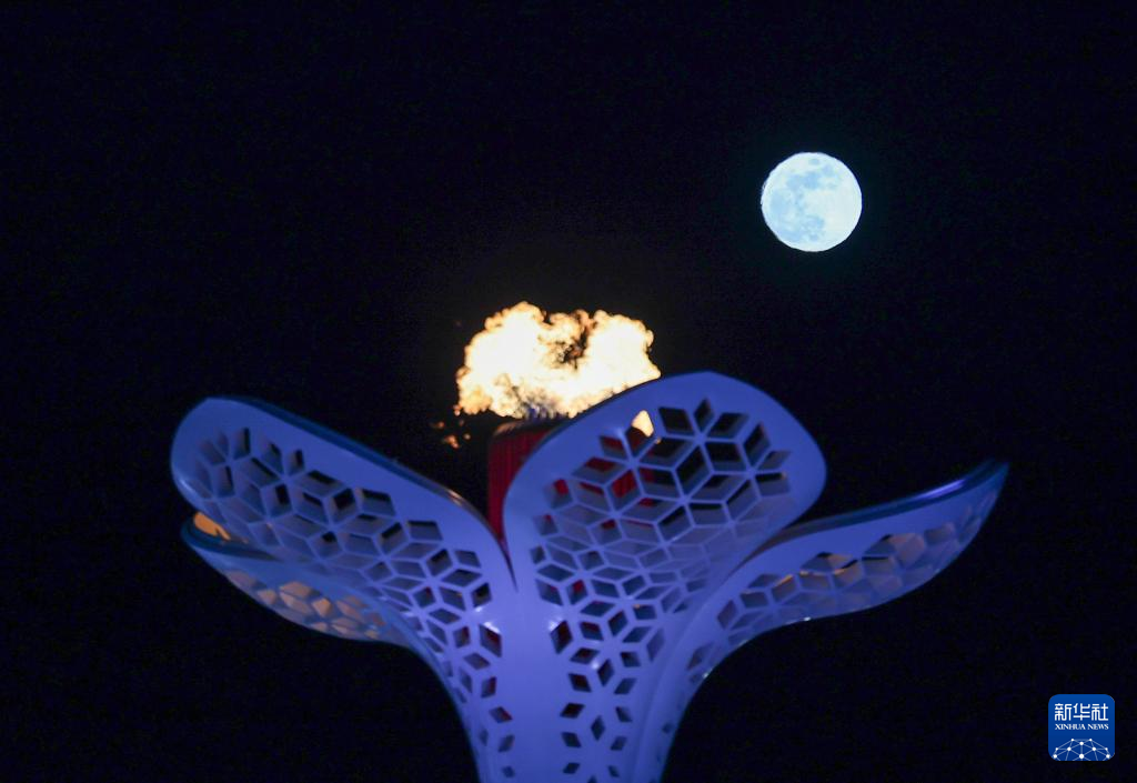 2月12日,一轮圆月从亚冬会主火炬上升起。