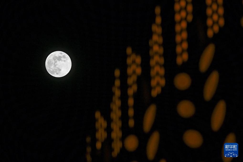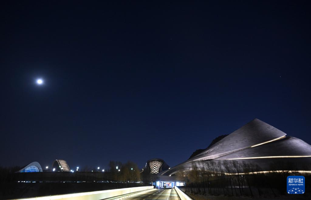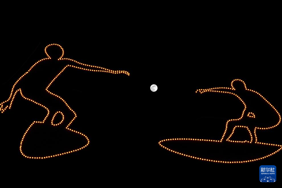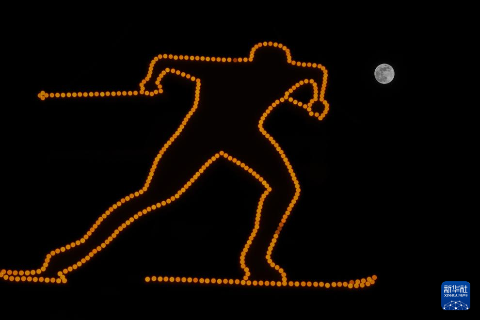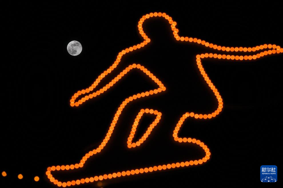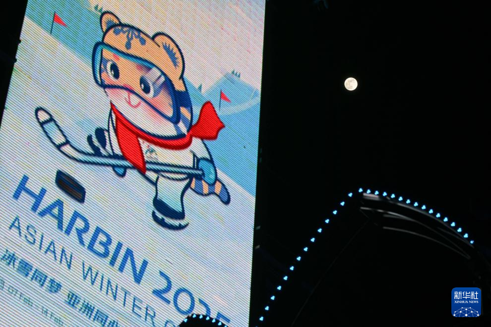2月12日,一轮圆月从亚冬会主火炬上升起。