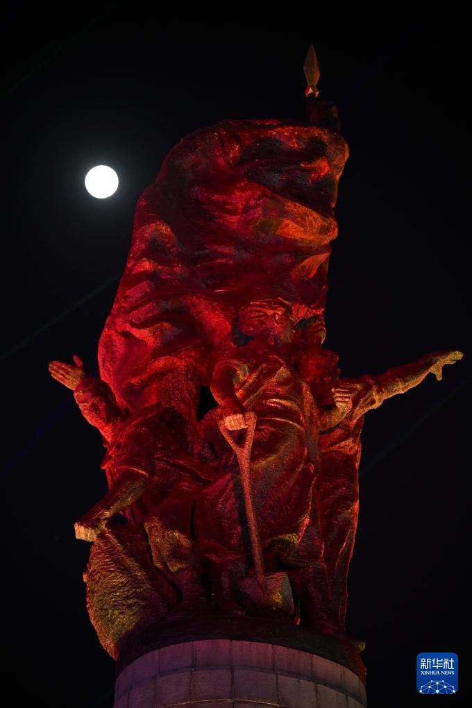 这是2月12日在哈尔滨人民防洪胜利纪念塔拍摄的月亮。