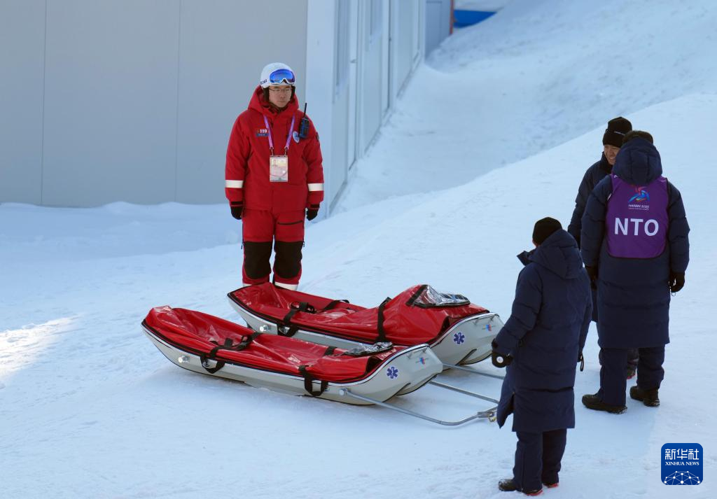 2月11日,雪域救援专业人员(左)值守在第九届亚冬会自由式滑雪男子空中技巧双人同步赛场内。