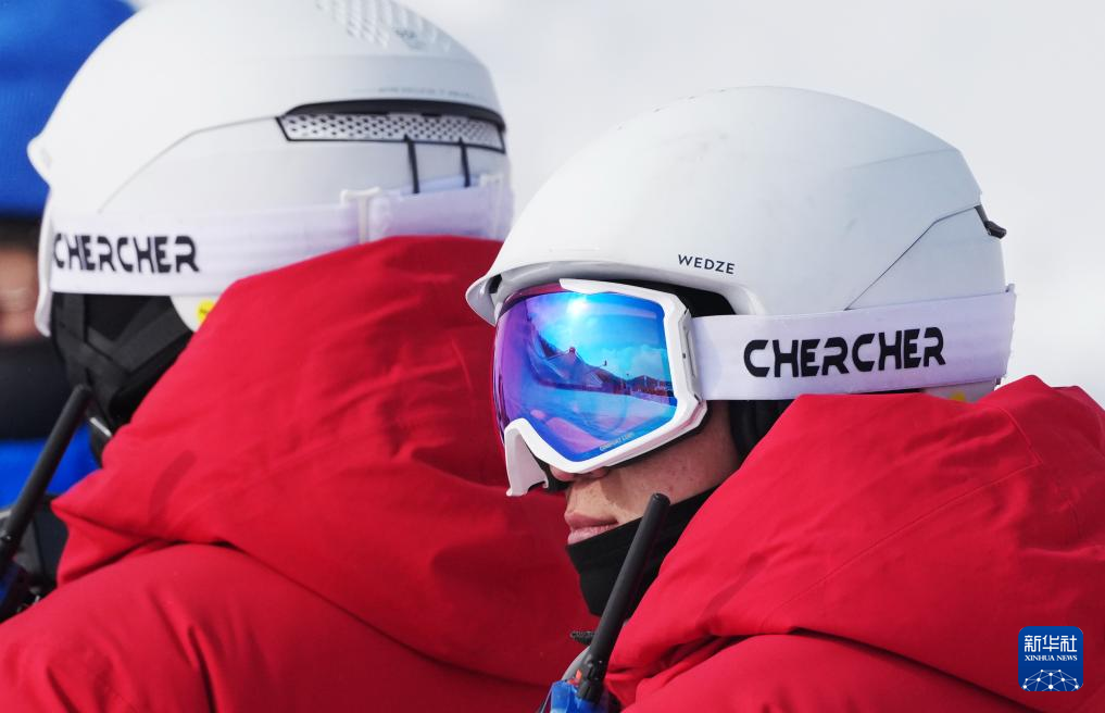 2月12日,一名雪域救援专业人员(右)值守在第九届亚冬会自由式滑雪女子大跳台赛场内。