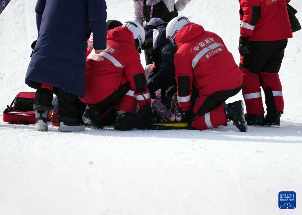 2月12日,救援人员在第九届亚冬会自由式滑雪女子大跳台决赛赛场援助受伤的运动员。