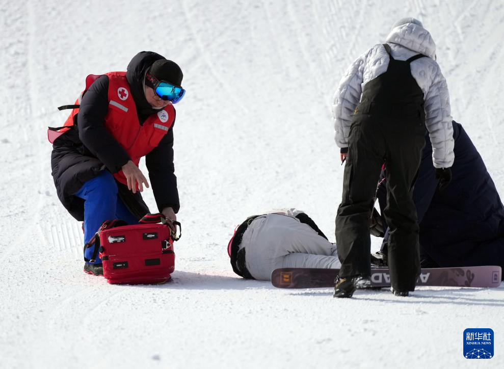 2月12日,医疗保障人员(左)在第九届亚冬会自由式滑雪女子大跳台决赛赛场治疗受伤的运动员。