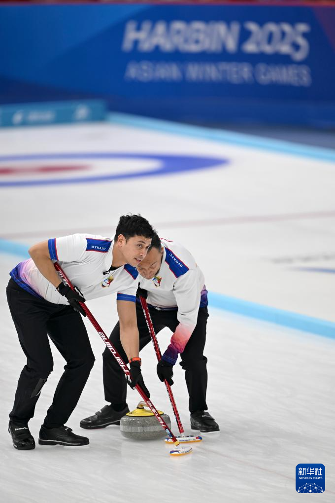2月13日,菲律宾队选手恩里克·加布里埃尔·普菲斯特(右)和克里斯蒂安·帕特里克·哈勒在比赛中擦冰。