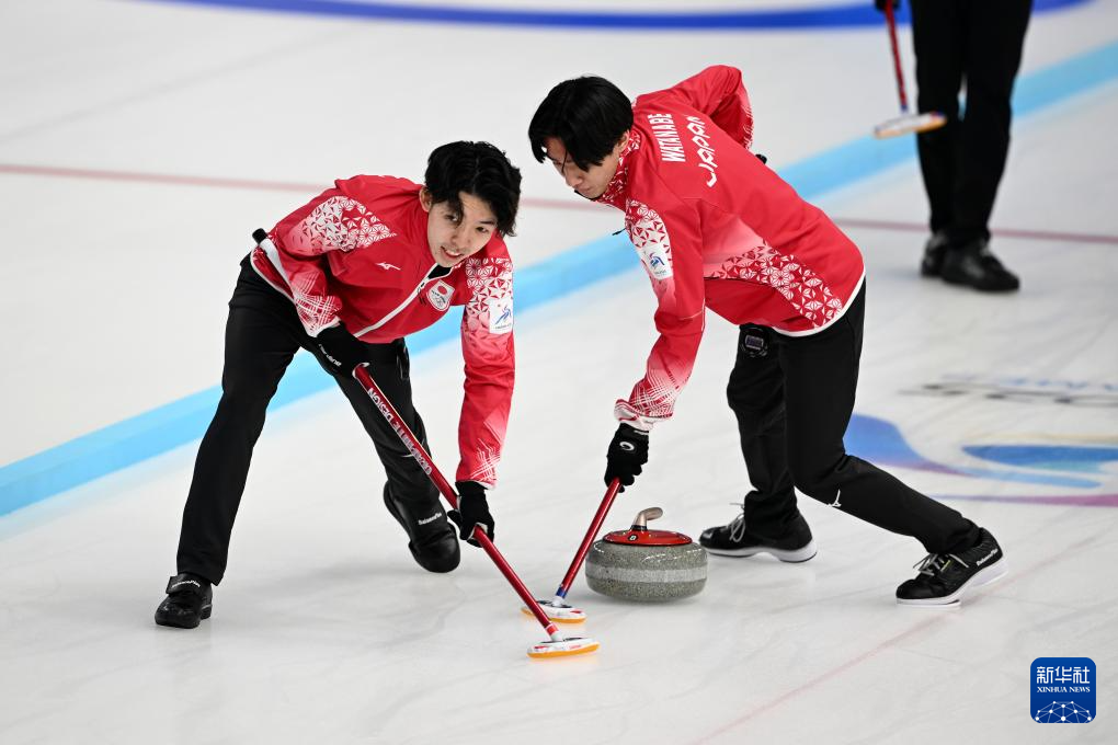 2月13日,日本队选手宫樱介(左)和渡边阳纪在比赛中擦冰。