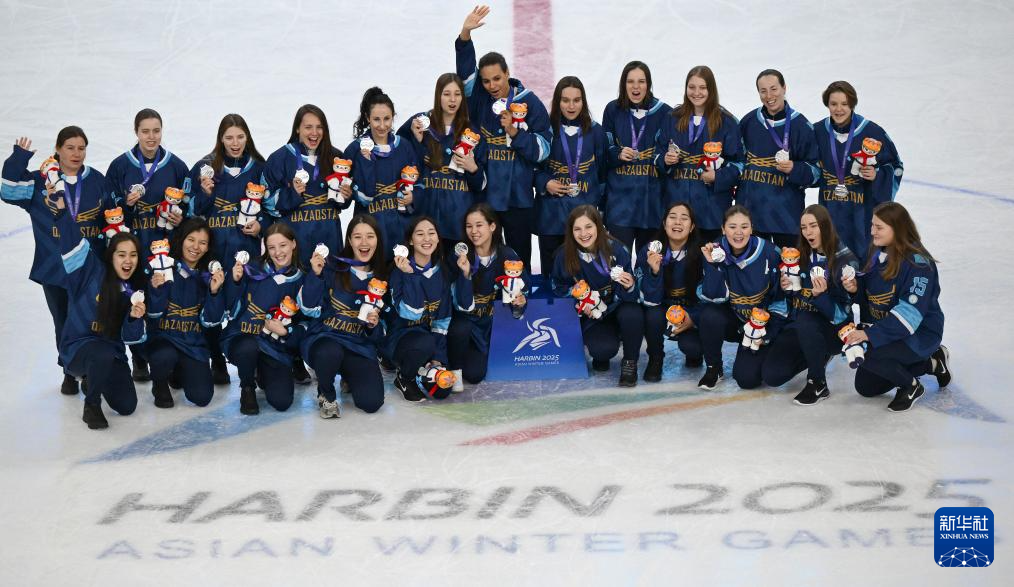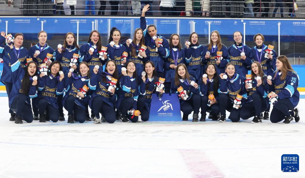 2月14日,亚军哈萨克斯坦队在颁奖仪式后合影。